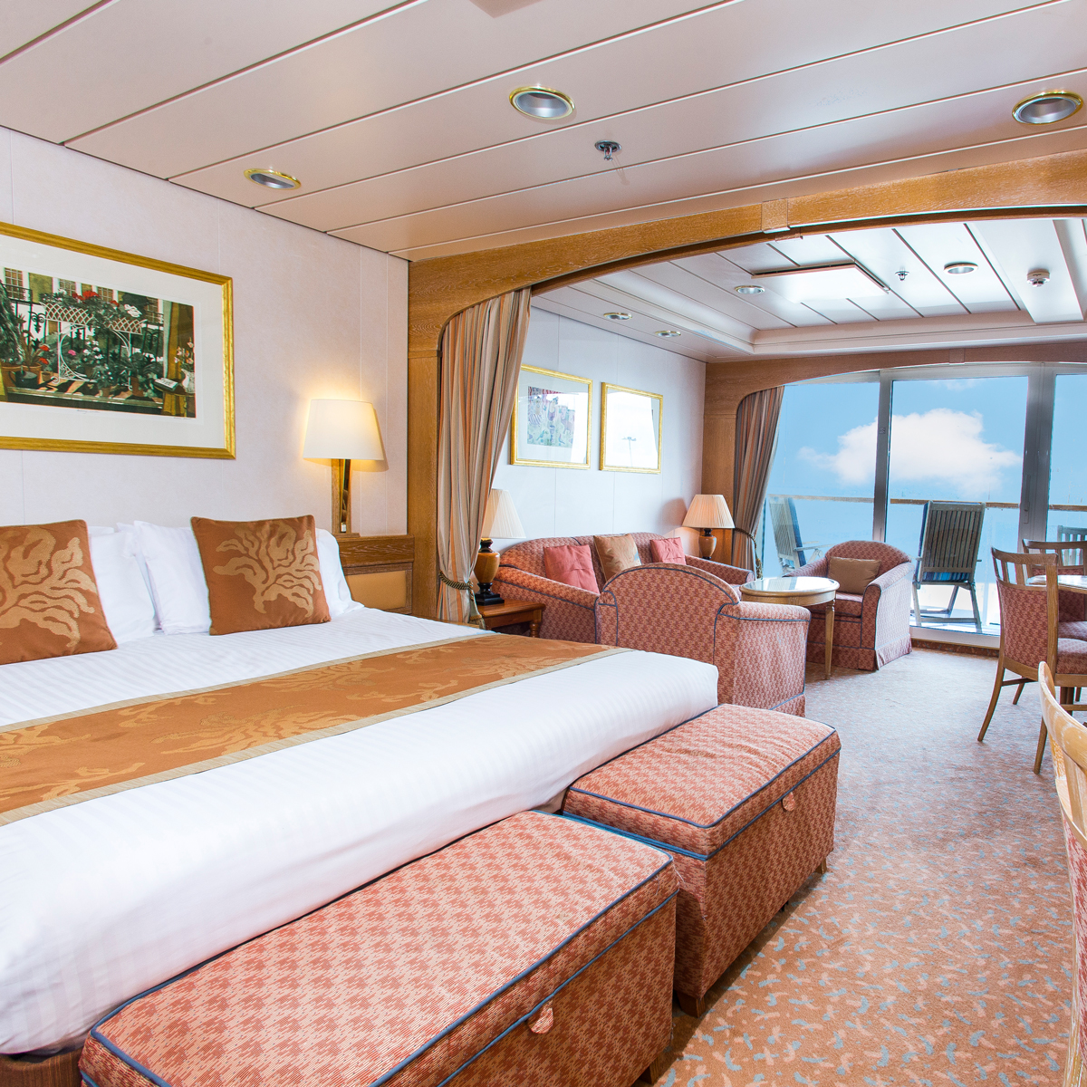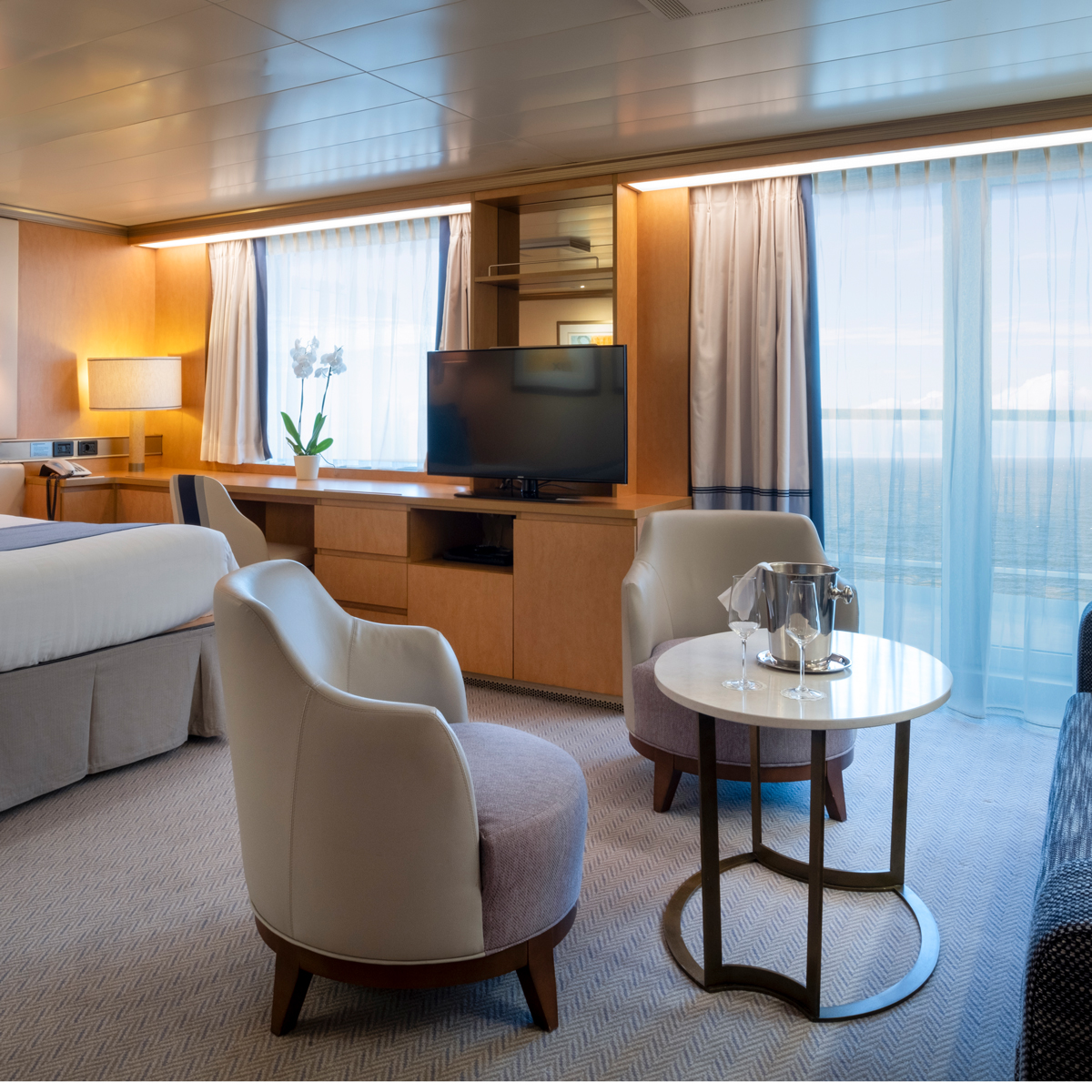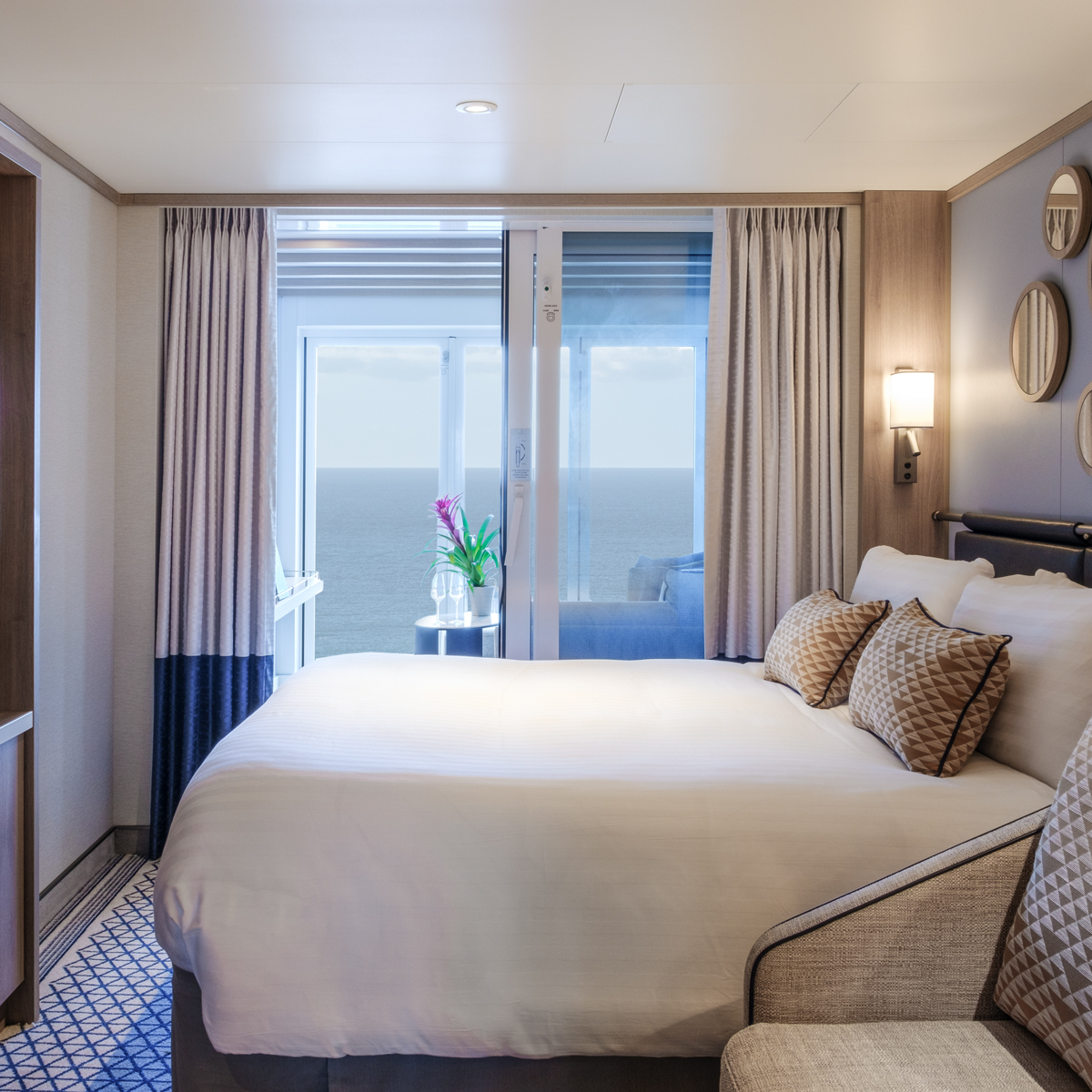 • Conservatory Mini-Suiten auf der Iona und der Arvia sind ca. 25,5 m² groß, verfügen über einen zusätzlichen "Conservatory"- bzw. Wintergarten-Loungebereich sowie bodentiefe Glastüren zum Balkon, die für eine besonders helle Raumwirkung sorgen.
