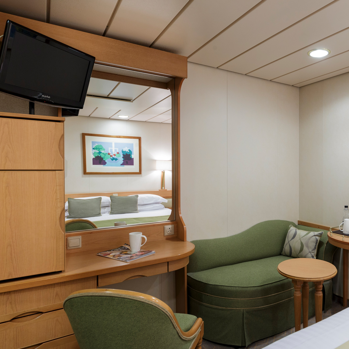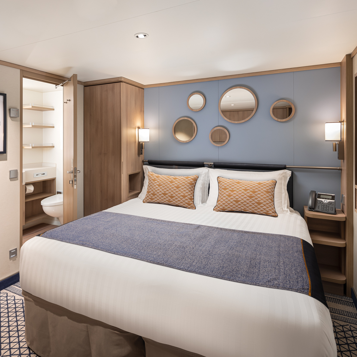 Alle Kabinen sind mit Klimaanlagen ausgestattet und bieten genügend Platz für entspannte Stunden in privater Umgebung. Viele verfügen außerdem über einen Balkon, der Ihnen herrliche Aussichten im Freien ermöglicht. Bettwäsche aus ägyptischer Baumwolle, Tee- und Kaffeemaschinen, Kühlschrank, Fön, Safe, TV und ein Badezimmer mit Pflegeprodukten zählen zur Standardausrüstung. Außerdem steht Ihnen ein persönlicher Kabinensteward zur Verfügung, der sich um Ihre Wünsche kümmert, und Sie können rund um die Uhr unseren kostenlosen Kabinenservice in Anspruch nehmen.