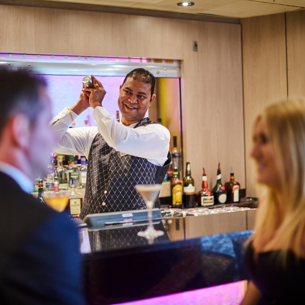 Throughout the ship, you can expect attentive service from our experienced staff. The waiters who serve you at your table each day will soon become familiar faces, and if you frequent our bars, our bartenders will remember your favourite drink.